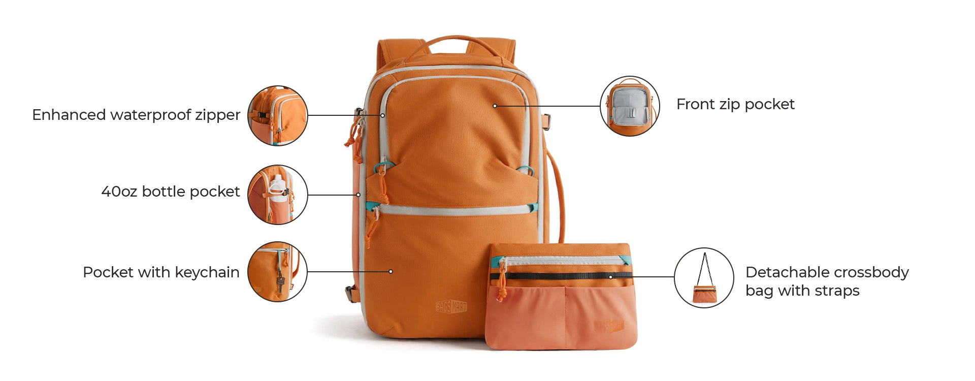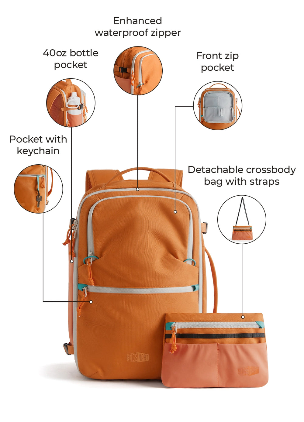 • 2 Fronttaschen mit Schlüsselanhänger und Einschubtaschen