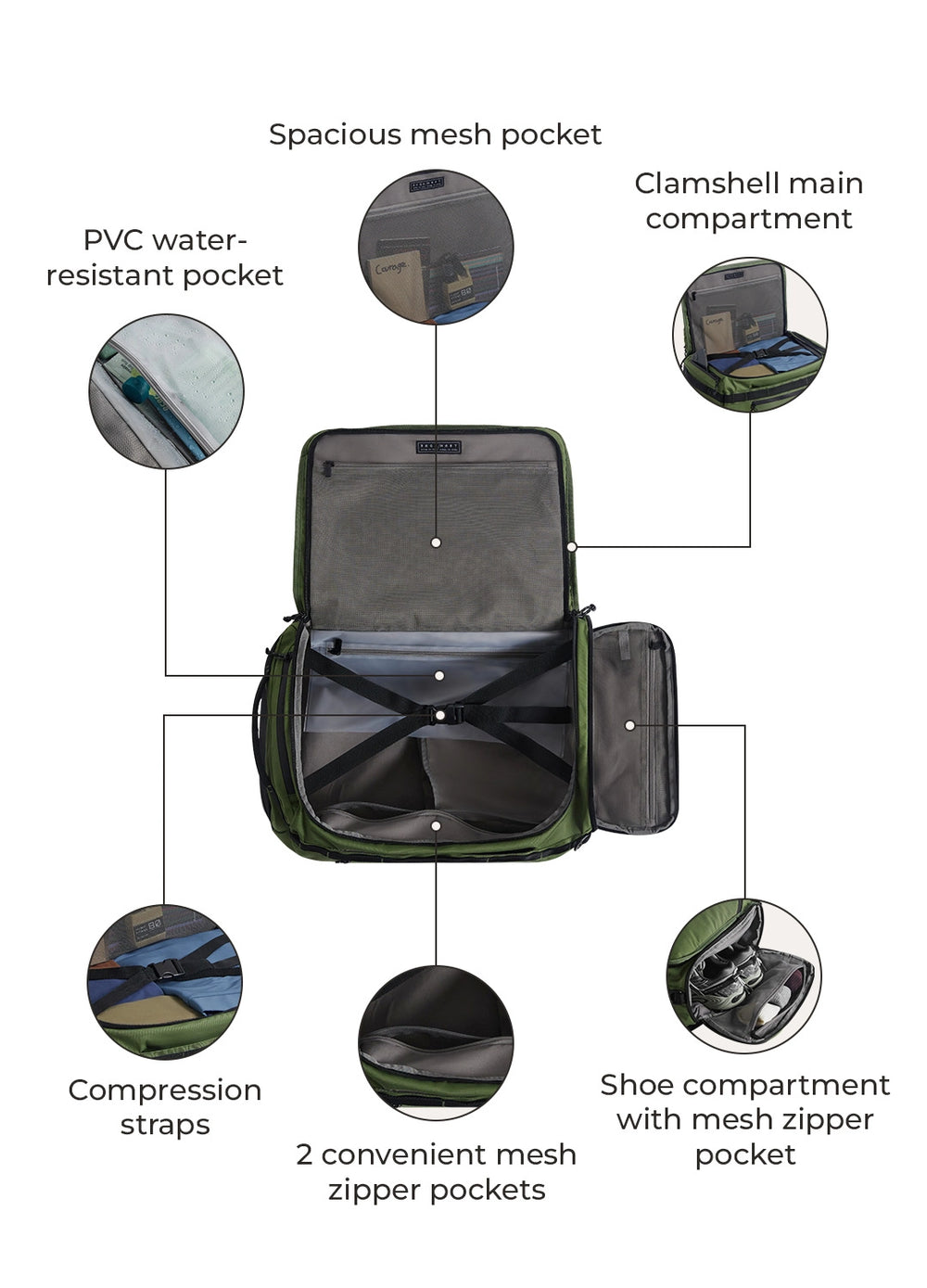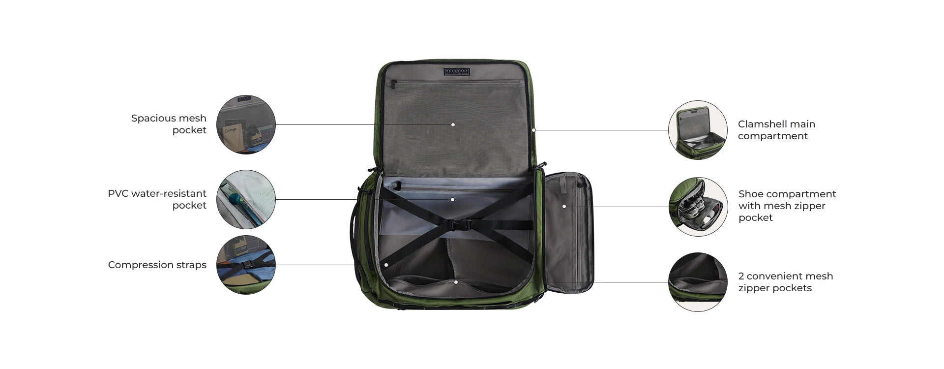 - 8 Außen- und 4 Innentaschen – darunter ein spezielles Schuhfach und eine sichere 15,6-Zoll-Laptophülle.