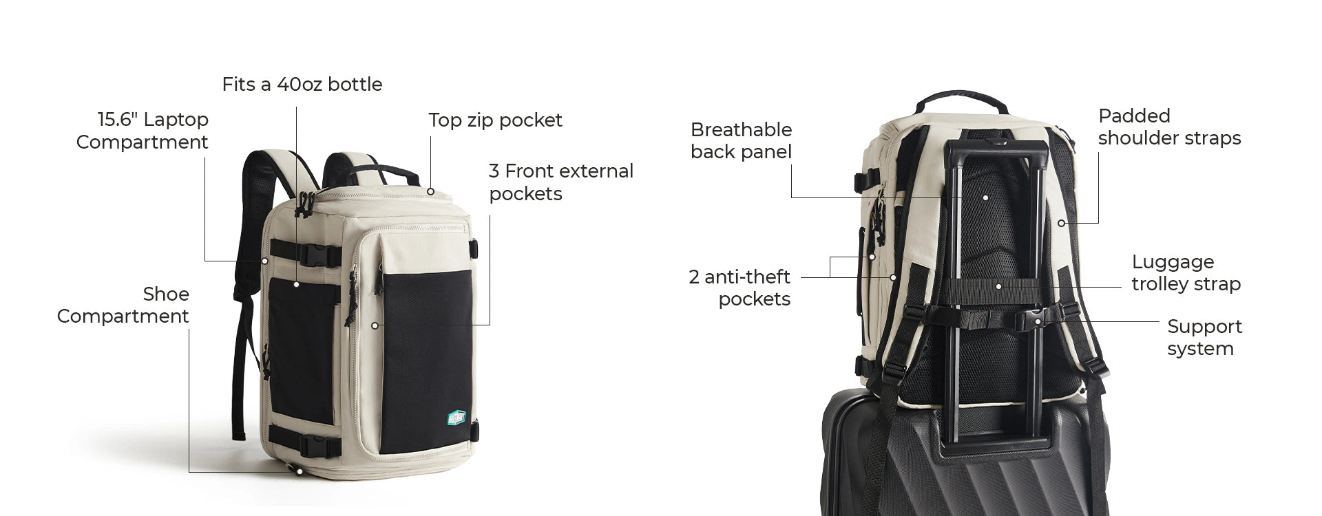- Laptopfach mit 180°-Öffnung: In das Hauptfach passt ein 15,6-Zoll-Laptop, und in ein kleineres Fach passen Gegenstände wie iPad, Kindle oder Nintendo Switch.