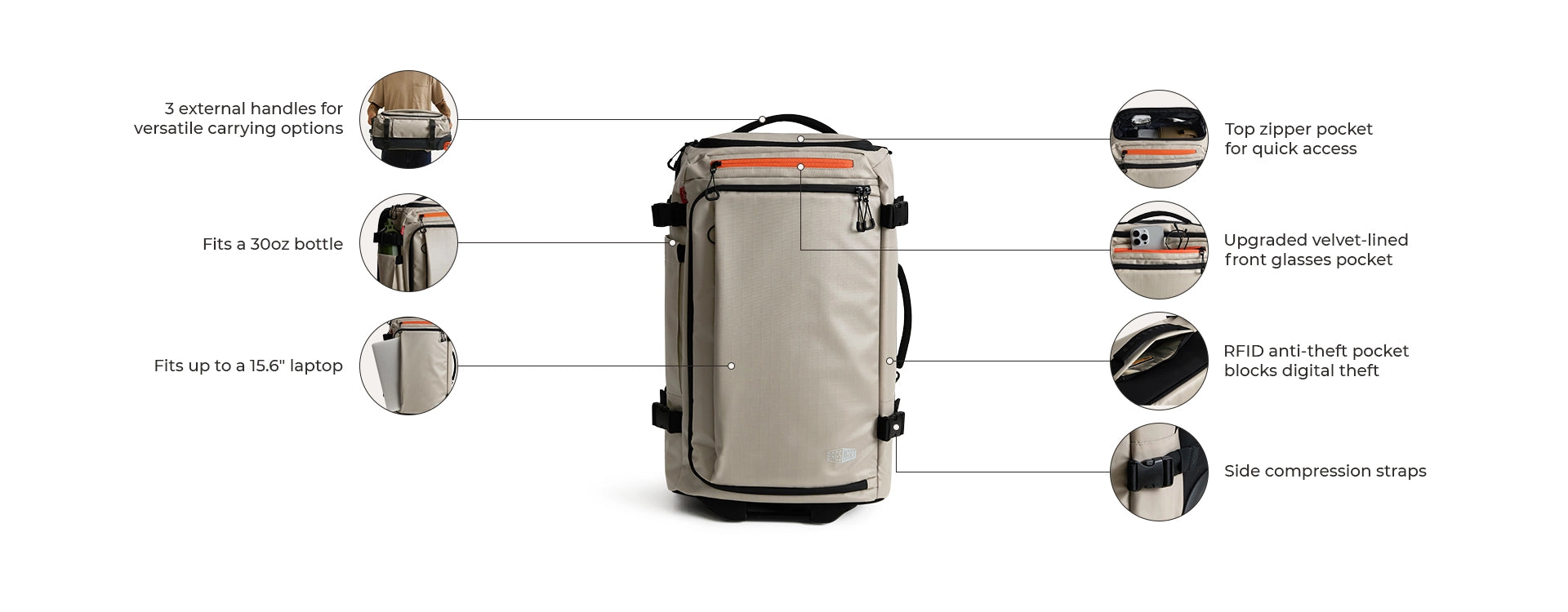 Ein Rucksack, der sich Ihren Plänen anpasst. Dank der leichtgängigen Rollen ist das Reisen am Flughafen mühelos, während die Rucksackträger zum Einsatz kommen, wenn es eng wird. Dank der übersichtlichen Aufteilung bleiben Ihr Laptop, Ihre Dokumente und wichtige Utensilien genau dort, wo Sie sie verstaut haben. So gelangen Sie mühelos vom Terminal bis zur Landung.