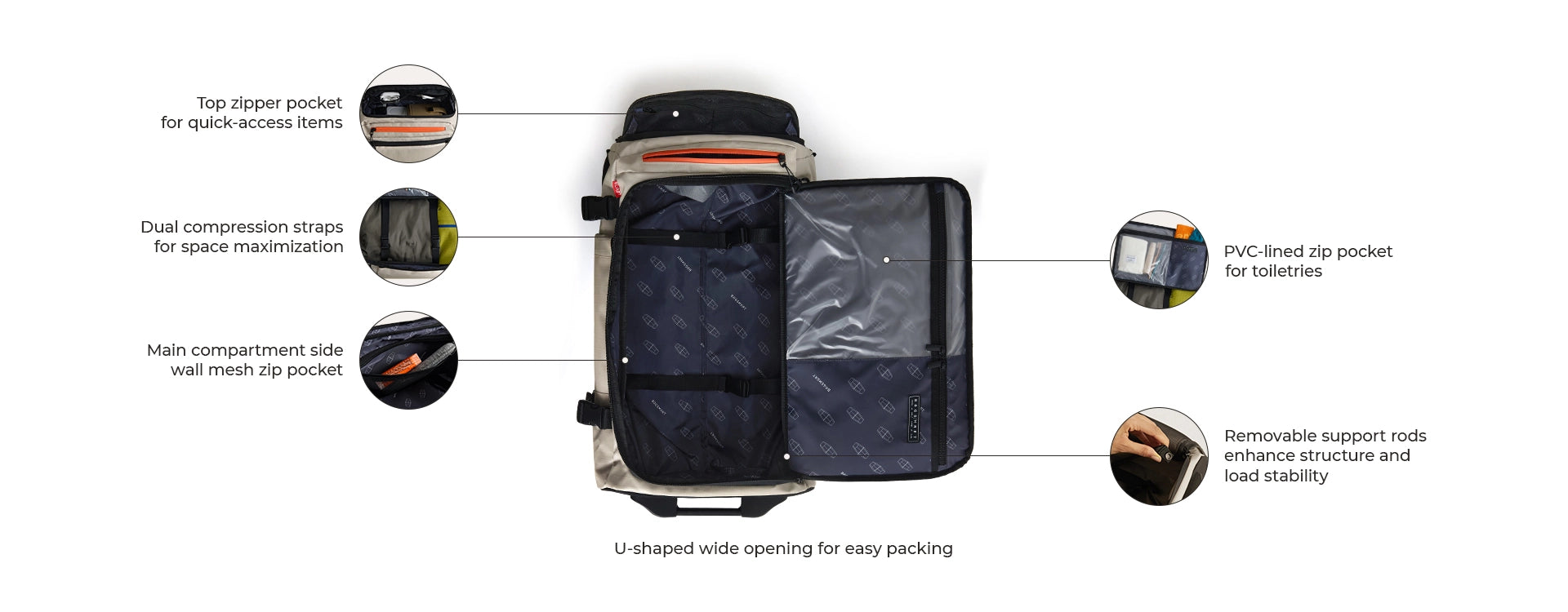 - Das geräumige Hauptfach ermöglicht eine smarte Packweise für Arbeit oder Reisen.